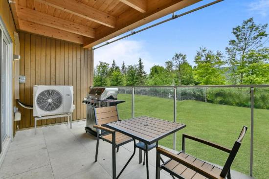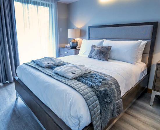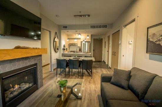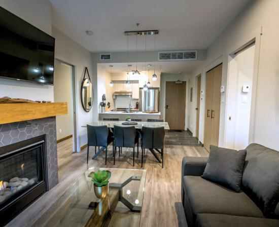 The one and two-bedroom suites are thoughtfully designed to blend modern luxury with comfort. Each suite features a fully equipped kitchen, a cozy living room with a fireplace, private balcony, and panoramic views of the lake or the mountains. The decor strikes the perfect balance between warmth and modernity. Enjoy direct access to Lac Moore with complimentary water sports equipment, or to unwind in the outdoor hot tub overlooking the mountains.