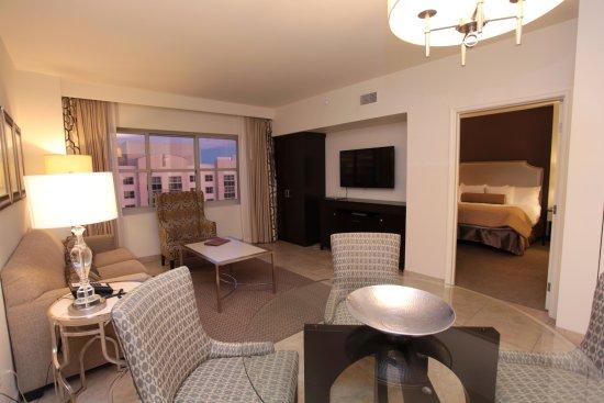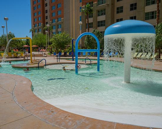 Enjoy the comfort of your unit and cook your favorite meals yourself, or grill them in the shared outdoor area of ??the beautiful Grandview, which overlooks the main street with the stunning desert landscape as a backdrop. This residence offers a modern gym, four swimming pools, and a spa with a waterfall, all complementing the peaceful and inviting setting. Nearby, you'll have access to restaurants such as Silverado Steak House and Vito's Garden buffet for affordable and delicious meals.